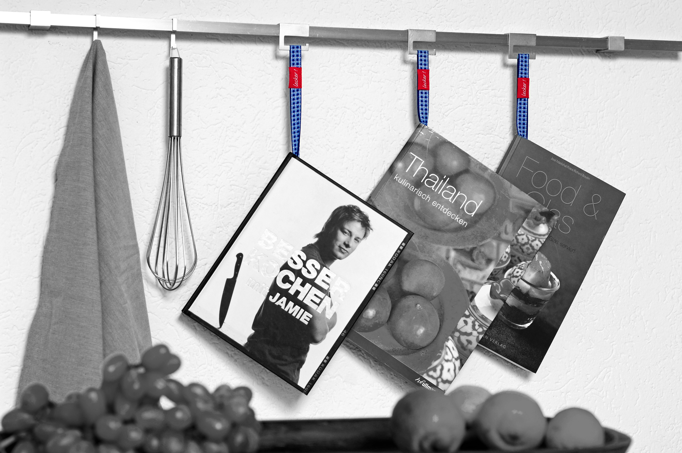 Der Buchaufhänger – eine neue Aufbewahrungsart, Bücher und Magazine zu präsentieren. Ein System für alle Größen von Büchern und Magazinen. Hanging books ist überall präsent, da wo du es brauchst. Das Kochbuch an der Kochleiste, die Nachtlektüre am Bettpfosten oder dein Lieblingsmagazin am Haken. Buchaufhänger und Lesezeichen in einem.